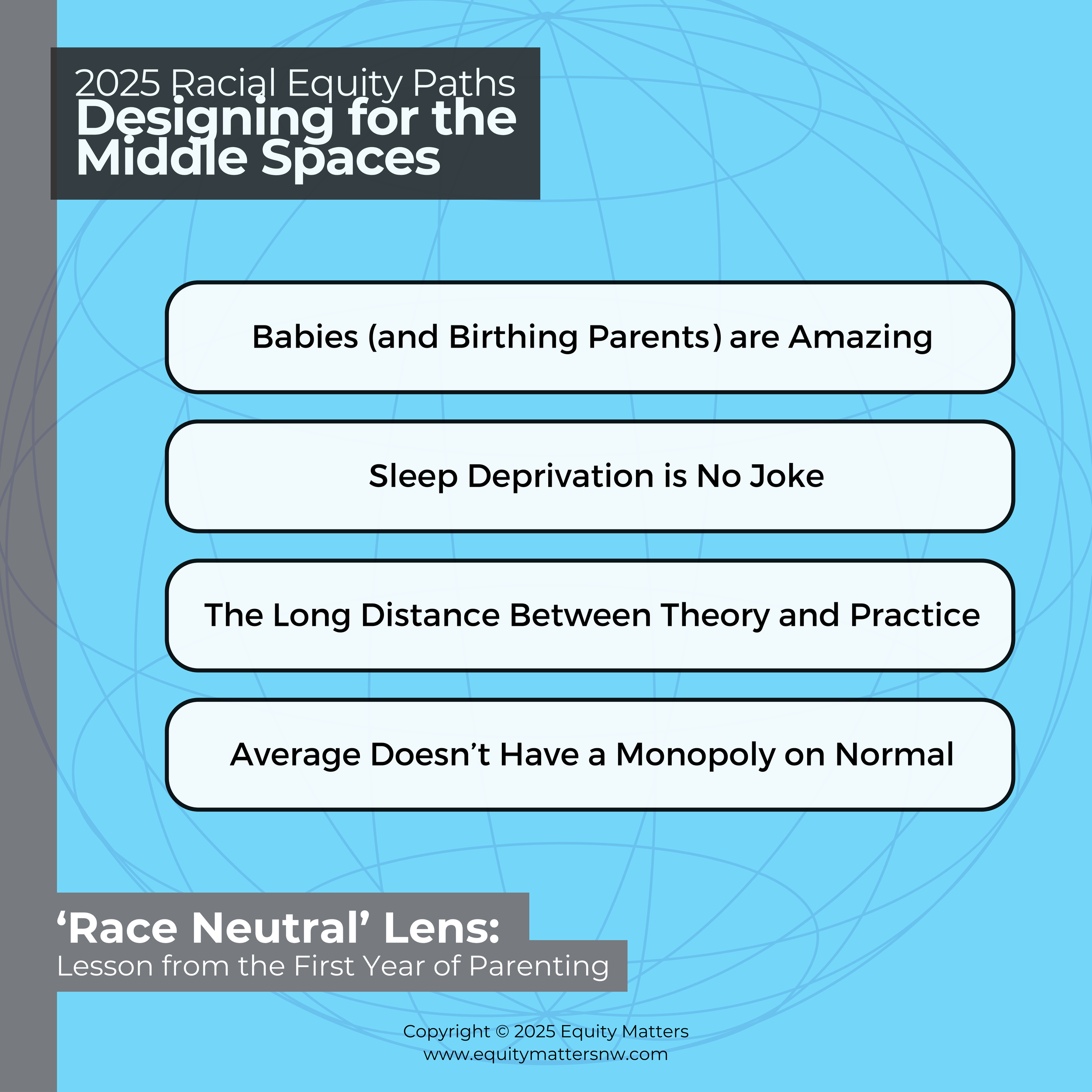 A graphic titled 2025 Racial Equity Paths: Designing for the Middle Spaces featuring four quotes: Babies (and Birthing Parents) are Amazing, Sleep Deprivation is No Joke, The Long Distance Between Theory and Practice, and Average Doesn’t Have a Monopoly on Normal. A note below reads Race Neutral Lens: Lesson from the First Year of Parenting.