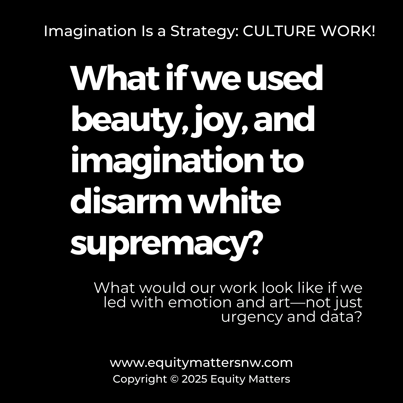Black background with white text that reads: What if we used beauty, joy, and imagination to disarm white supremacy? What would our work look like if we led with emotion and art—not just urgency and data?