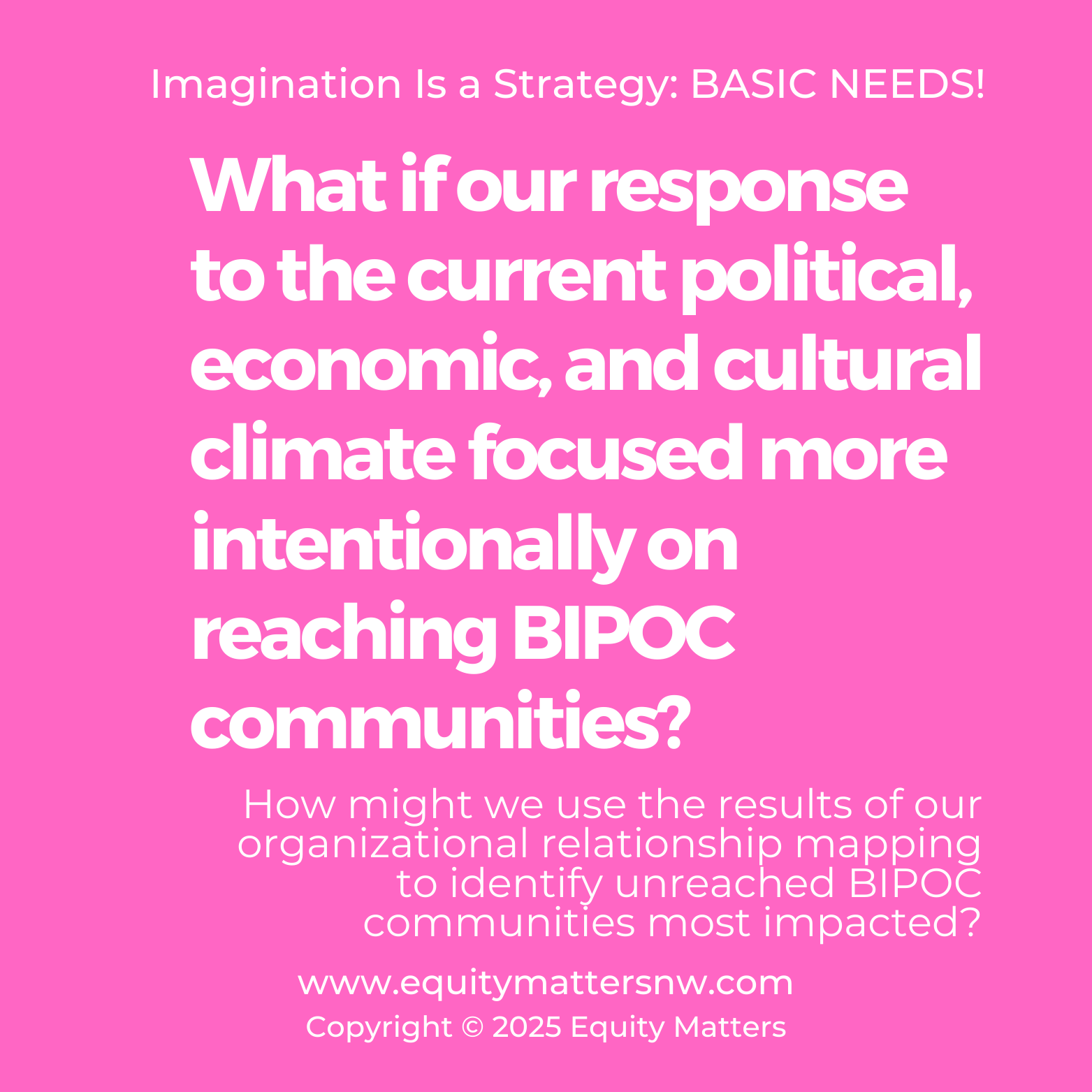 Pink background with white text that reads: What if our response to the current political, economic, and cultural climate focused more intentionally on reaching BIPOC communities? How might we use the results of our organizational relationship mapping to identify unreached BIPOC communities most impacted?
