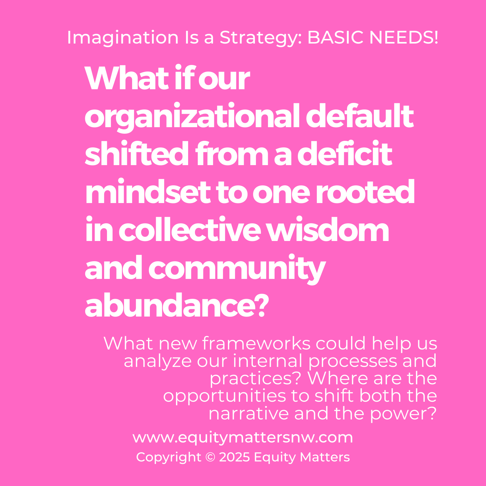 Pink background with white text that reads: What if our organizational default shifted from a deficit mindset to one rooted in collective wisdom and community abundance? What new frameworks could help us analyze our internal processes and practices? Where are the opportunities to shift both the narrative and the power?